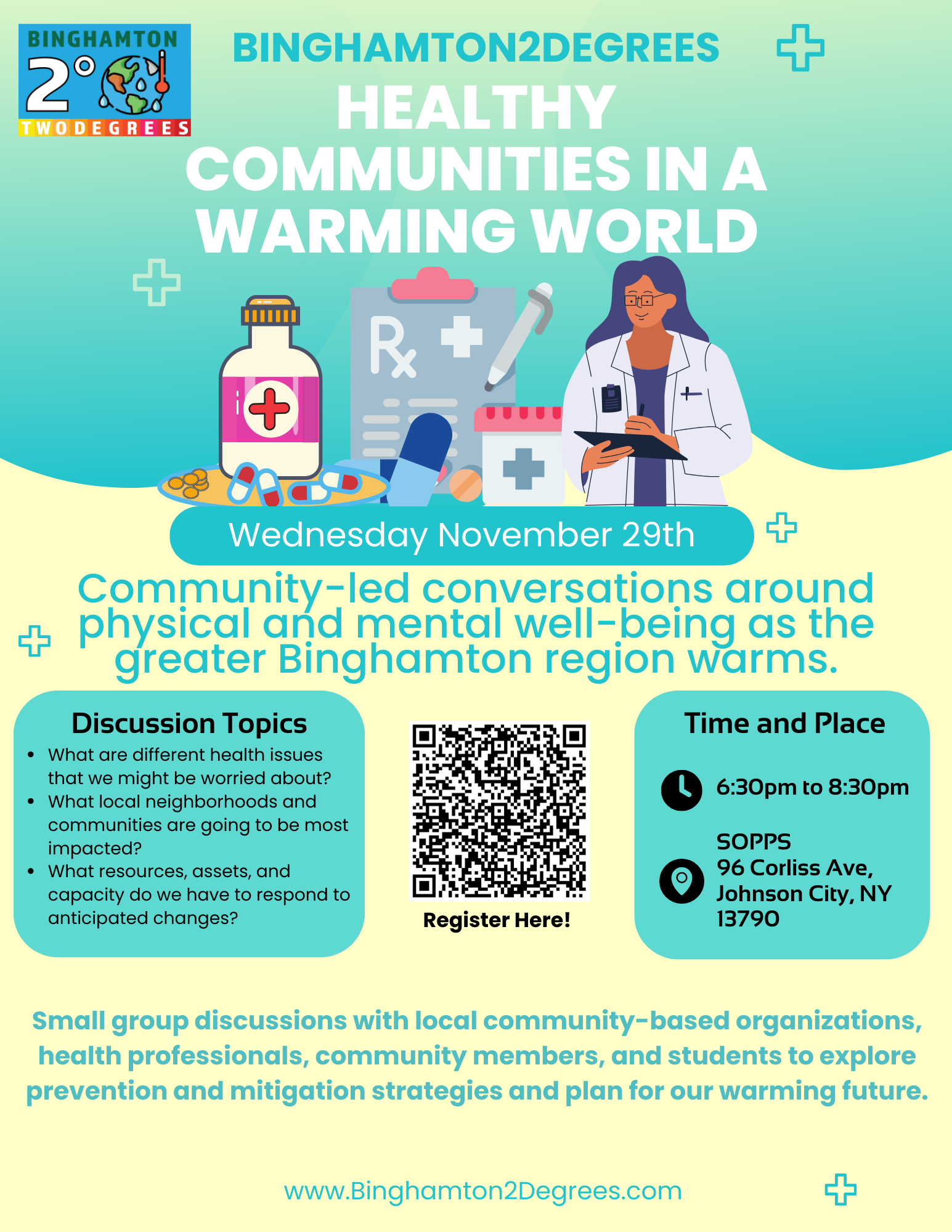 Binghamton 2 Degrees will host community-led conversations around physical and mental well-being as the greater Binghamton region warms along with the rest of the world. What are different health issues that we might be worried about? What local neighborhoods and communities are going to be most impacted? What resources, assets, and capacity do we have to respond to anticipated changes? And what will we need to develop? Join local community-based organizations and health experts for this timely and vital event. We will use small group discussions to explore prevention and mitigation strategies and plan for our warming future.